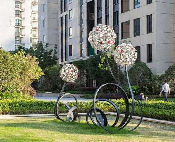 優(yōu)藝雕塑制作的這一款大型抽象不銹鋼蒲公英雕塑,總高約4.5米,雕塑放置在高檔小區(qū)公園草地景觀,